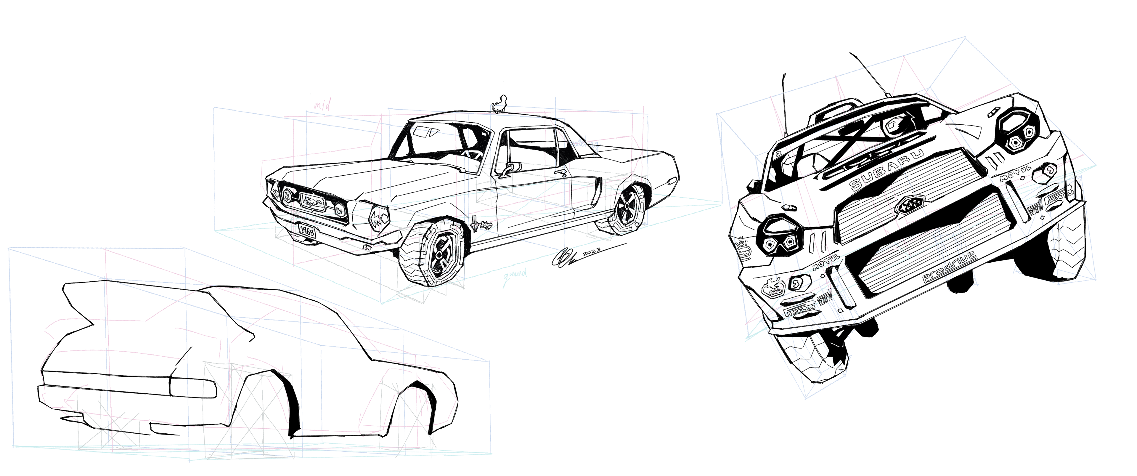 Some car studies I have been working on! In an attempt to learn how to illustrate cars in a way that is dynamic, interesting, and appealing to the viewer.