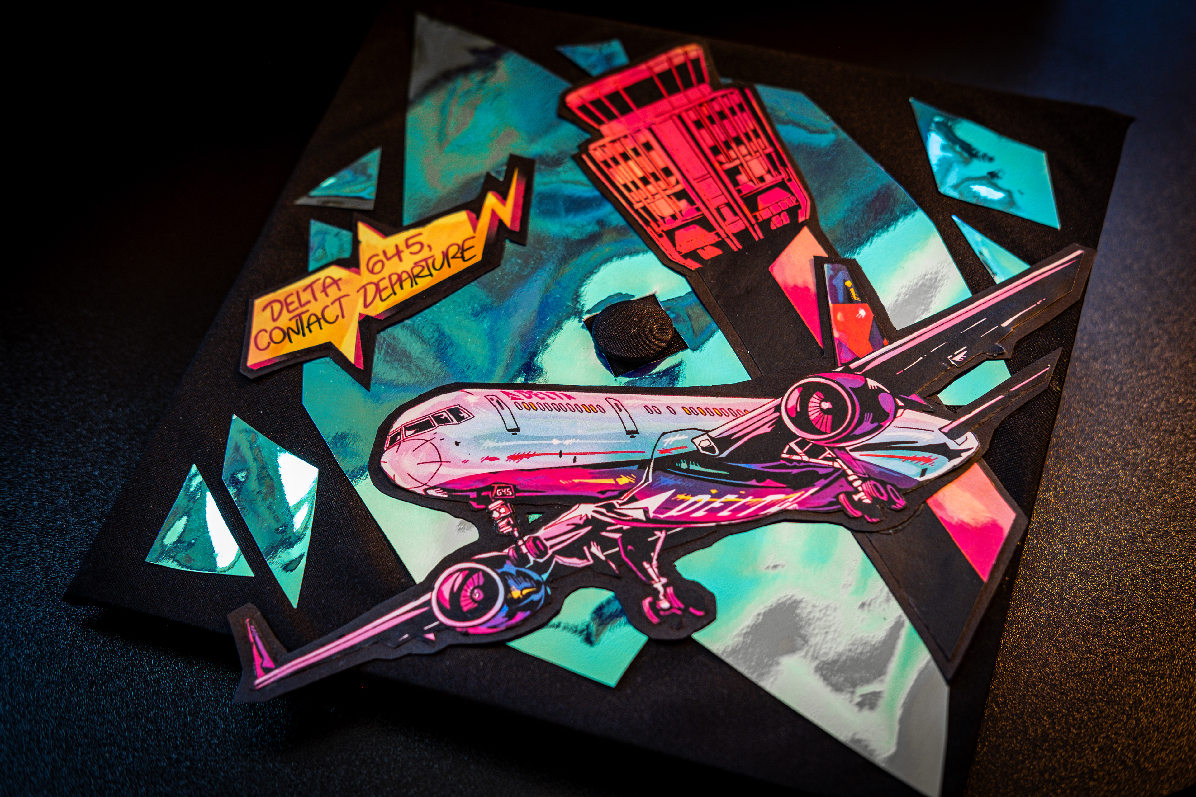 I graduated in May 2024 from Embry-Riddle Aeronautical University and wanted to design my grad cap as one of my last major projects at the school. I wanted to feature both my degrees from the school, Aeronautical Science and Air Traffic Management.
